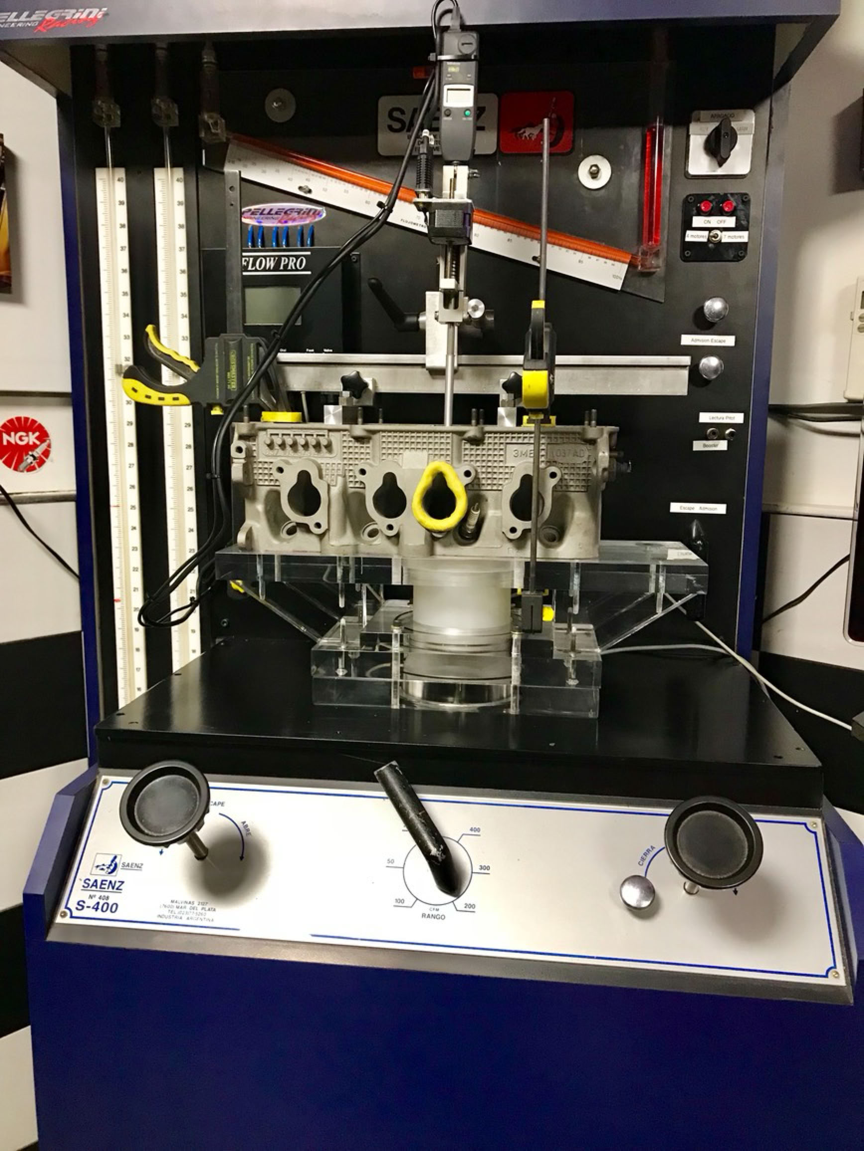 Flujómetro Saenz S-400 Computarizado mediante el cual se mide con exactitud los caudales y velocidades de aire obtenidas en trabajos realizados en tapas de cilindro, múltiples de admisión, carburadores, mariposas de inyección, múltiples de escape, carcazas de turbinas,etc.
