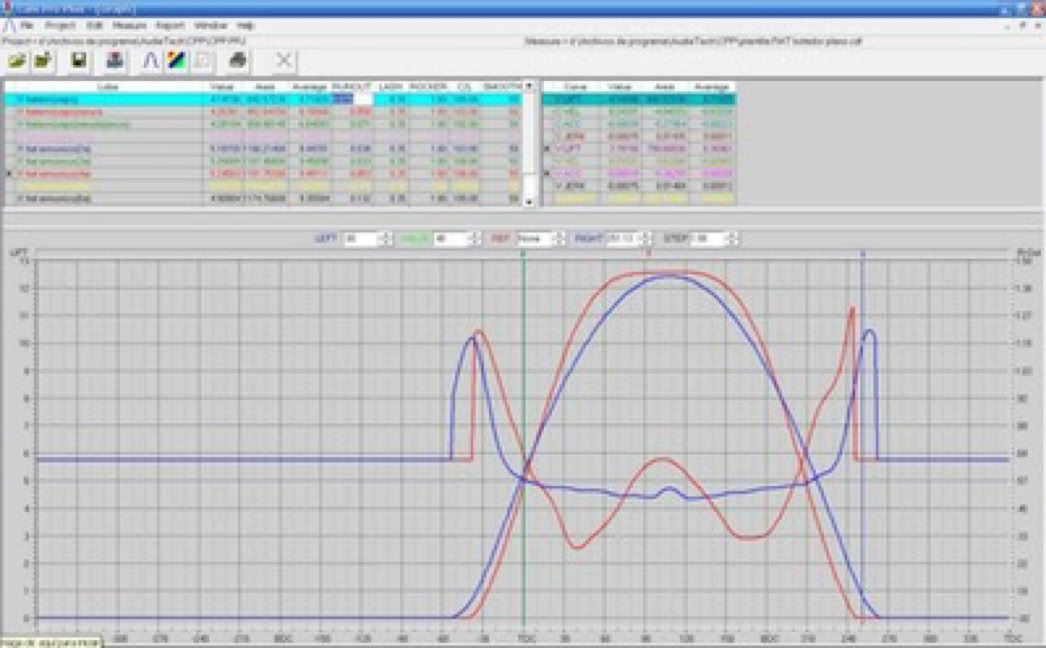 Poseemos un palpador electrónico de levas, “Cam Pro Plus”, el cual nos permite relevar una leva completa, entregando su curva completa de alzada por cada décima de grado. El software puede entregar además las curvas derivadas, velocidad, aceleración y jerk.