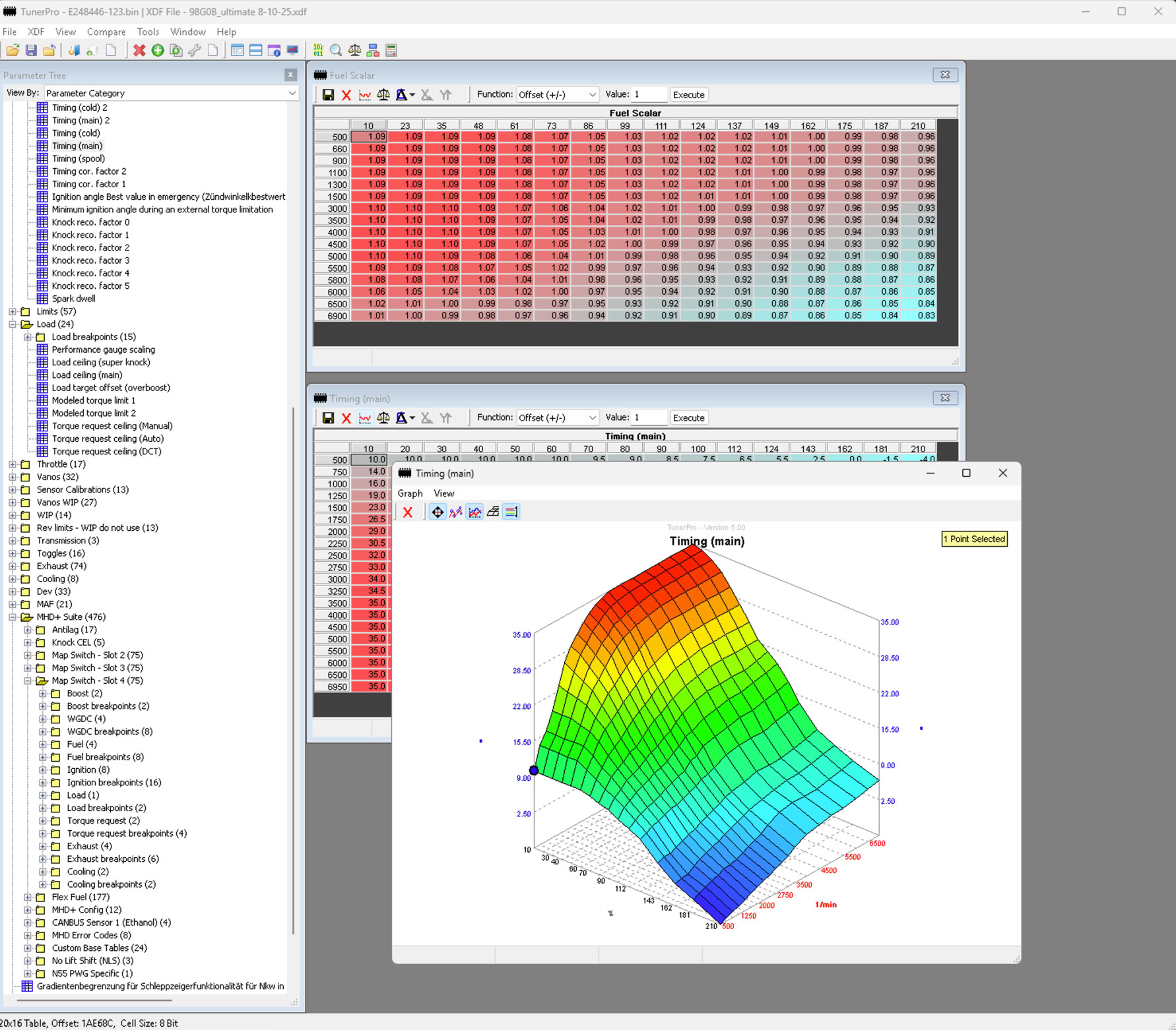 La gestión electrónica es el cerebro de nuestro proyecto. Utilizamos MHD y xHP para lograr una integración perfecta entre el motor N55 y la caja de 7 marchas. Gracias a la edición de mapas vía TunerPro, ajustamos cada celda de carga, compensando la falta de edición en tiempo real con un riguroso proceso de Data Logging (registro de datos) para perfeccionar el setup.
