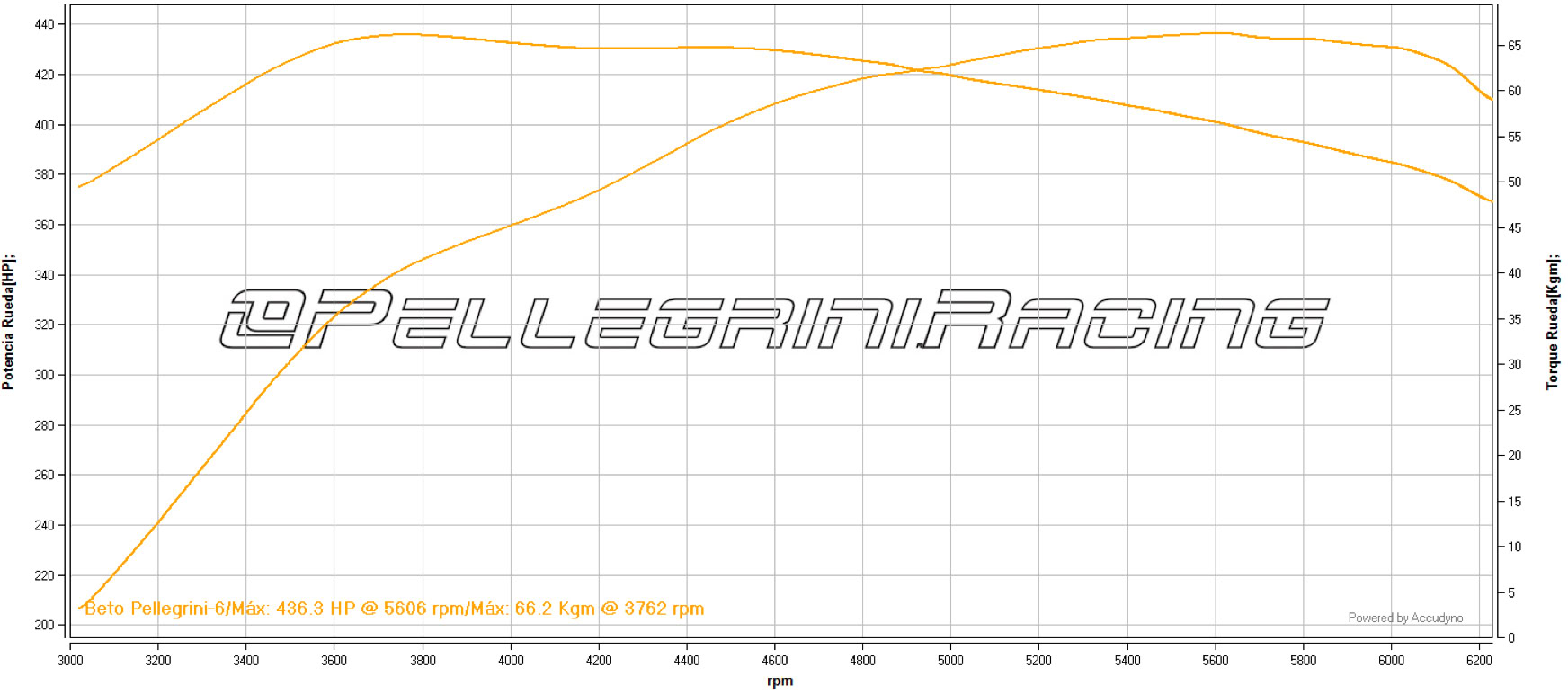 En el siguiente gráfico se detallan los valores de potencia y torque a la rueda obtenidos con el turbo PURE500. Con una Potencia y torque a la rueda de 436 WHP y 66 Kgm.