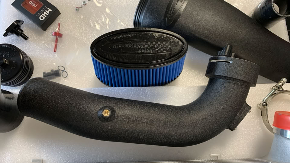 Para garantizar la integridad del sistema bajo presión, reemplazamos el ducto de admisión original de plástico por uno de aluminio de alta resistencia. Complementamos esta mejora con un sistema de inducción de Burger Motorsports (BMS), que incluye un filtro de aire de alto flujo. Esta combinación no solo elimina el riesgo de roturas por fatiga del material, sino que optimiza el caudal de aire y mejora notablemente la respuesta del turbo.