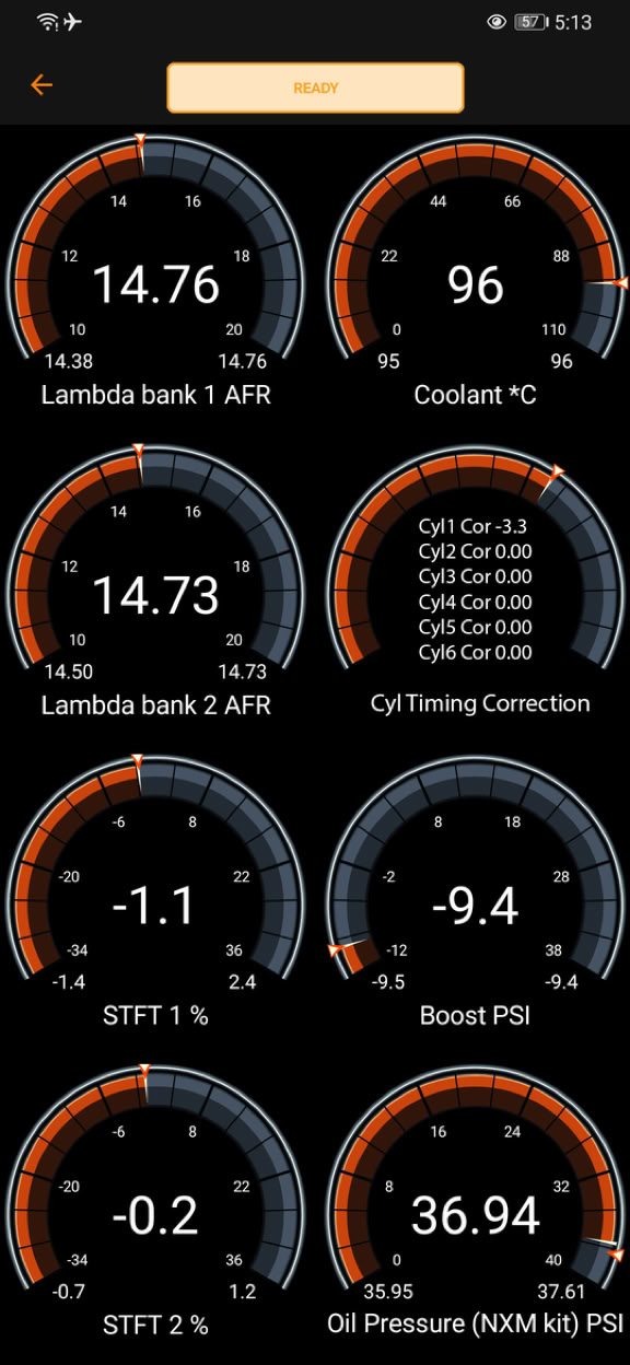 Estimando una pérdida por transmisión del 13% —un valor estándar para vehículos de estas características—, las cifras al motor ascienden a 501 Hp y 76 Kgm de torque. Estos valores, obtenidos con una presión de aproximadamente 19 psi, representan el límite máximo de caudal que el turbocompresor original puede suministrar.